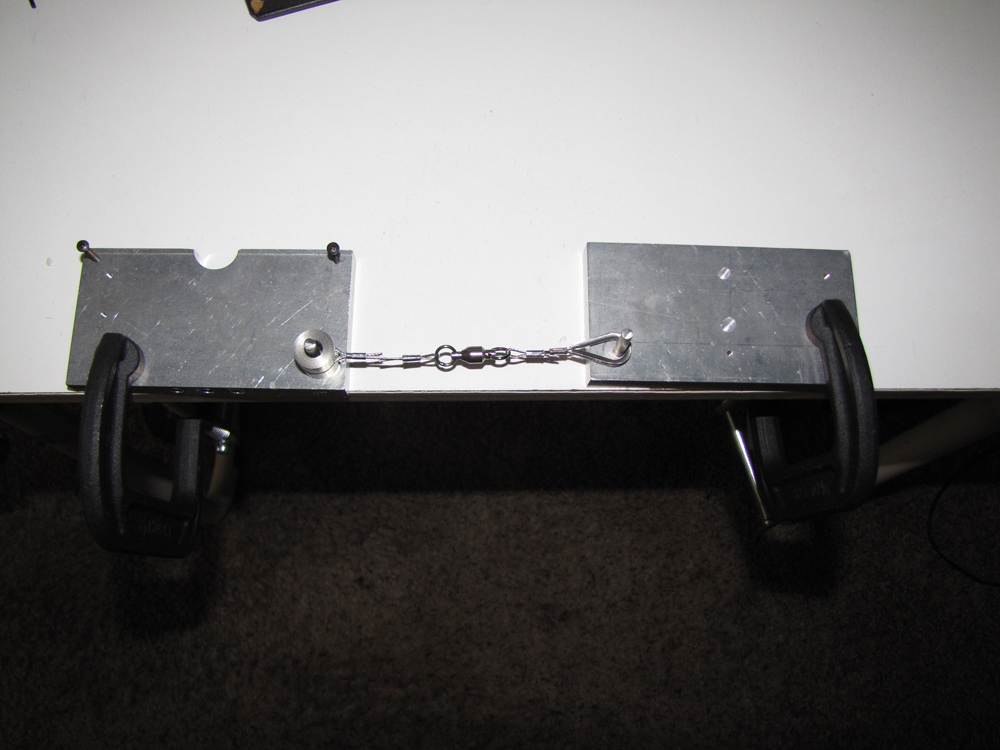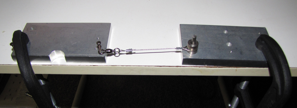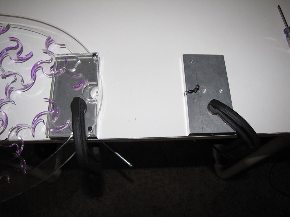 This shows how the left piece can be used to attach a mobile piece to a swivel.  Put the mobile piece under the acrylic piece of the jig and then clamp that side down down to the table (always support the left side of the piece to avoid any damage).  Next, screw a swivel into the other jig and set it to the measured distance and clamp it down.  Tie the fishing line between the swivel and the piece and you're done.  Note the half-round cutout on the jig and acryli to make it easier to tie.