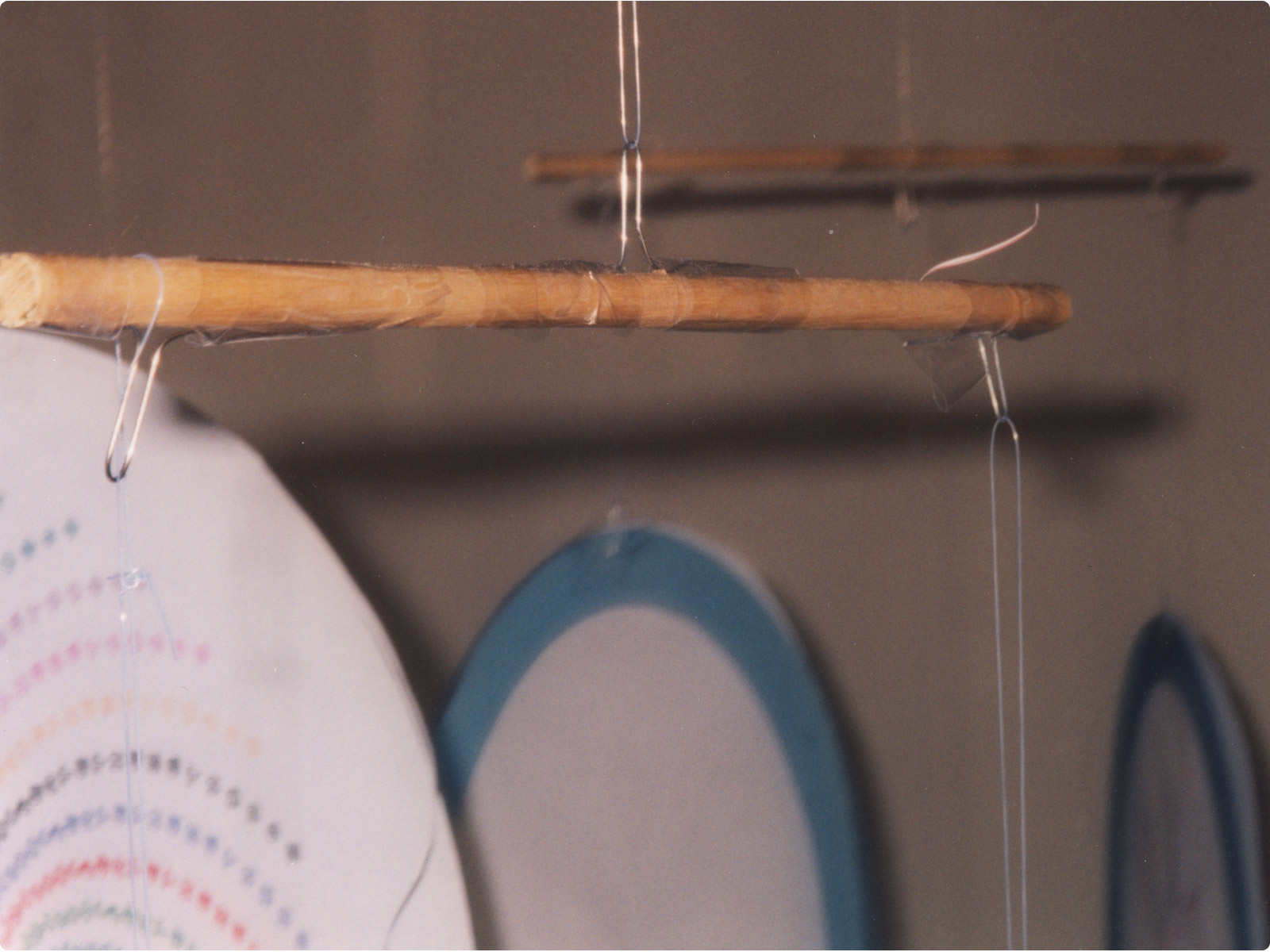 An 80 lb. test braided fishing line is used to affix the decorative objects to the rod.  Use a heavy line that can handle slight abrasion of the line over the years as the mobile moves in the breezes.  This line is much heavier than is needed but it never hurts to have a safety factor built in.