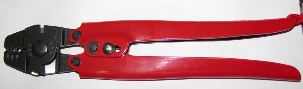 Below is a swaging tool that can handle three different sizes of cables.  This tool should be sufficient for any reasonably sized mobile.  Anything larger and you're talking about much different tooling and cable.  It kinds of looks like a cable stripping tool but don't be tempted to use that.  Right tool for the right job sort of thing.